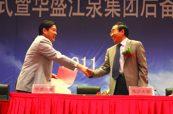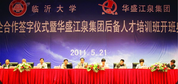 2011年5月21日,臨沂大學(xué)華盛江泉集團(tuán)校企合作簽字暨華盛江泉集團(tuán)后備人才培訓(xùn)班開班盛典在江泉城舉行。出席典禮儀式并在主席臺就坐的領(lǐng)導(dǎo)有:臨沂大學(xué)校長韓延明博士,臨沂大學(xué)商學(xué)院院長、教授、許汝貞博士,臨沂大學(xué)繼續(xù)教育處處長李殿勇教授,臨沂大學(xué)商學(xué)院培訓(xùn)中心主任、王郡華教授,臨沂大學(xué)商學(xué)院刁玉柱博士,羅莊區(qū)人民政府吳漢林副區(qū)長,沈泉莊黨委于孝燕書記,沈泉莊黨委副書記、華盛江泉集團(tuán)高洪路總經(jīng)理,沈泉莊黨委副書記、華盛江泉集團(tuán)王廷寶副總經(jīng)理,以及臨沂電視臺、臨沂人民廣播電臺、臨沂日報(bào)社等新聞媒體的記者和集團(tuán)所有高管、各單位管理人員及后備人才等,共800余人出席會(huì)議。